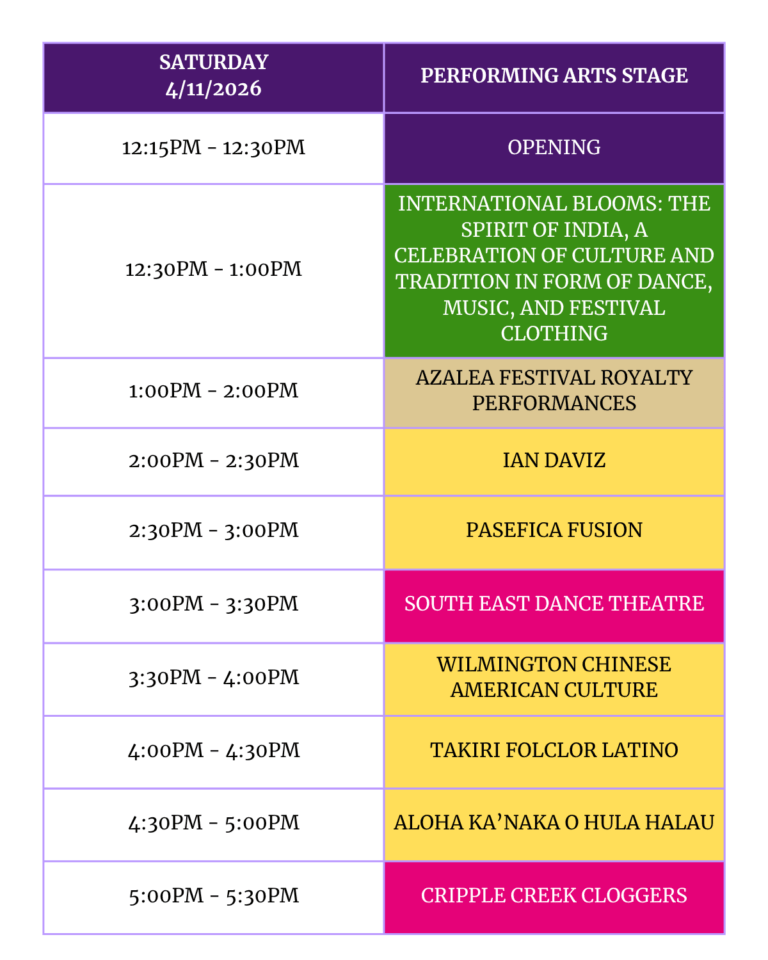 Stop by the Performing Arts Stage to watch live performances from local dance and theater groups, multicultural performance organizations, and members of our Azalea Queens Court!